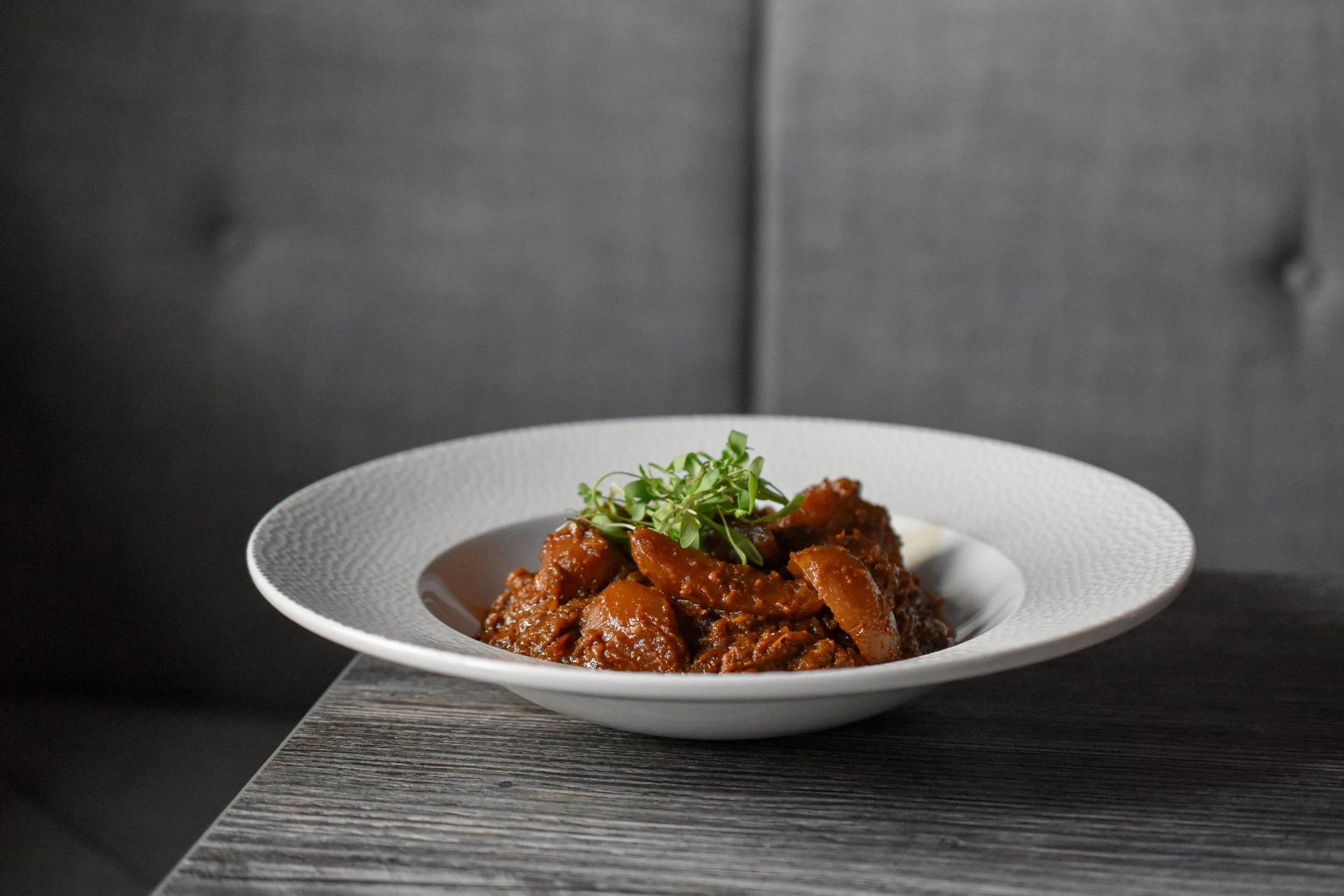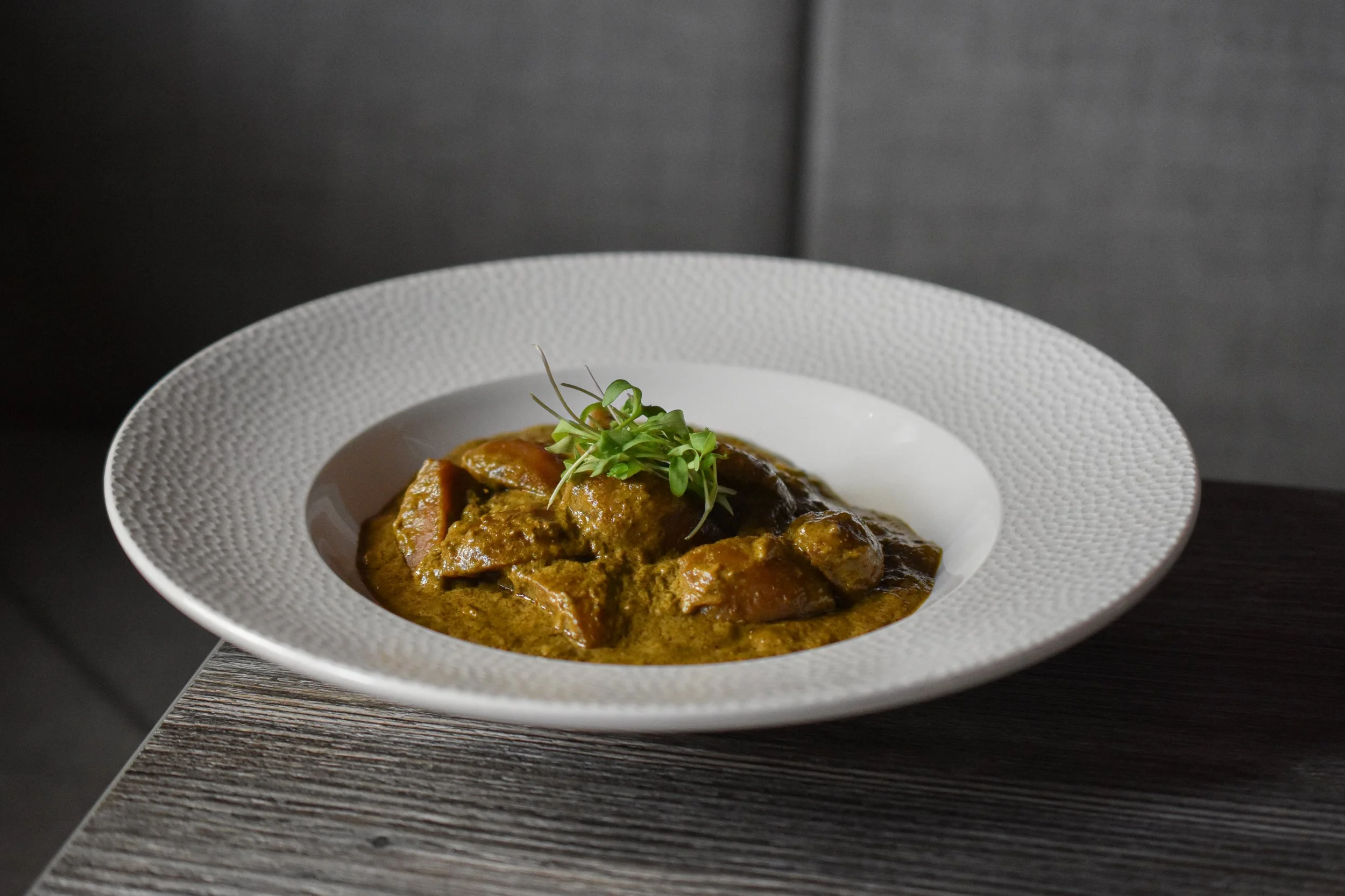 A bold dish from South Indian cuisine, our Lamb Malabar is made with leg of lamb, carefully carved in house and slow cooked for hours with bone marrow for exceptional depth and richness. As the lamb cooks gently, it becomes tender and deeply infused with spice, while the marrow melts into the sauce, adding body and intensity. Finished in a southern Indian style, it carries a medium spice with a gentle kick, rich, warming, and full of character. Popular across our Indian restaurants in Pwllheli, Porthmadog, and Bangor for the past two to three years, it has become a favourite among guests who enjoy depth, spice, and slow cooked flavour