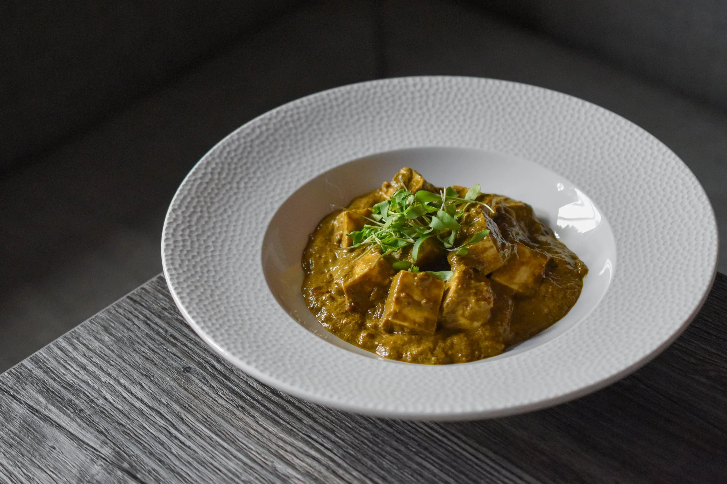 A refined classic from Indian cuisine, our Palak Paneer is built on a smooth spinach gravy, gently lifted with a touch of mint and coriander for freshness and balance. Tempered with coriander seeds, hot chilli powder, fresh green chillies, and selected spices, the sauce develops warmth and depth while keeping its natural vibrancy. Soft paneer is folded through the gravy, allowing it to absorb the flavours while retaining its delicate texture. Light yet comforting, with a silky finish and gentle spice, it is especially loved by those who enjoy a little warmth on the palate.