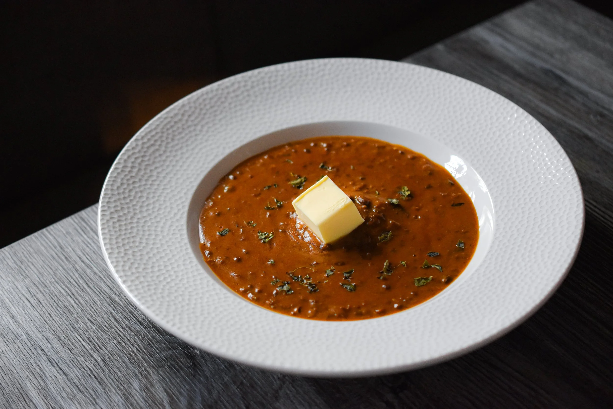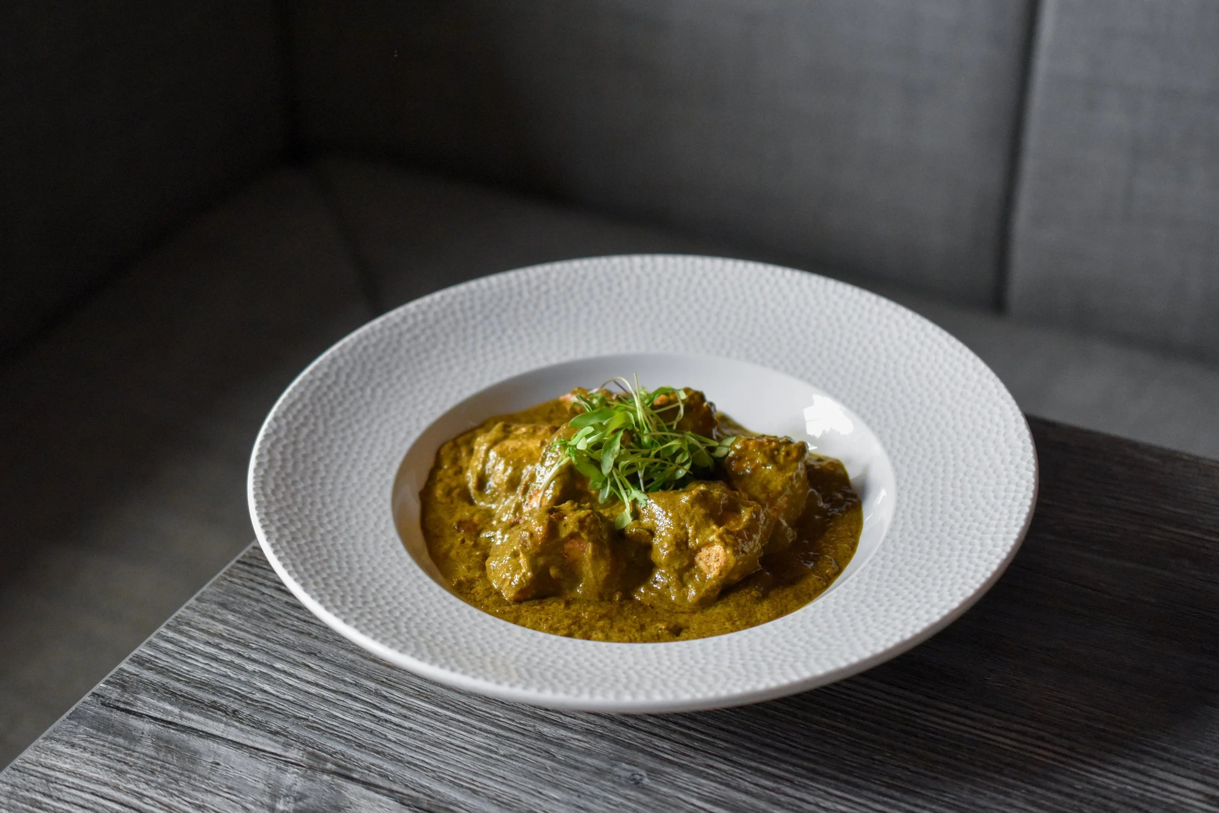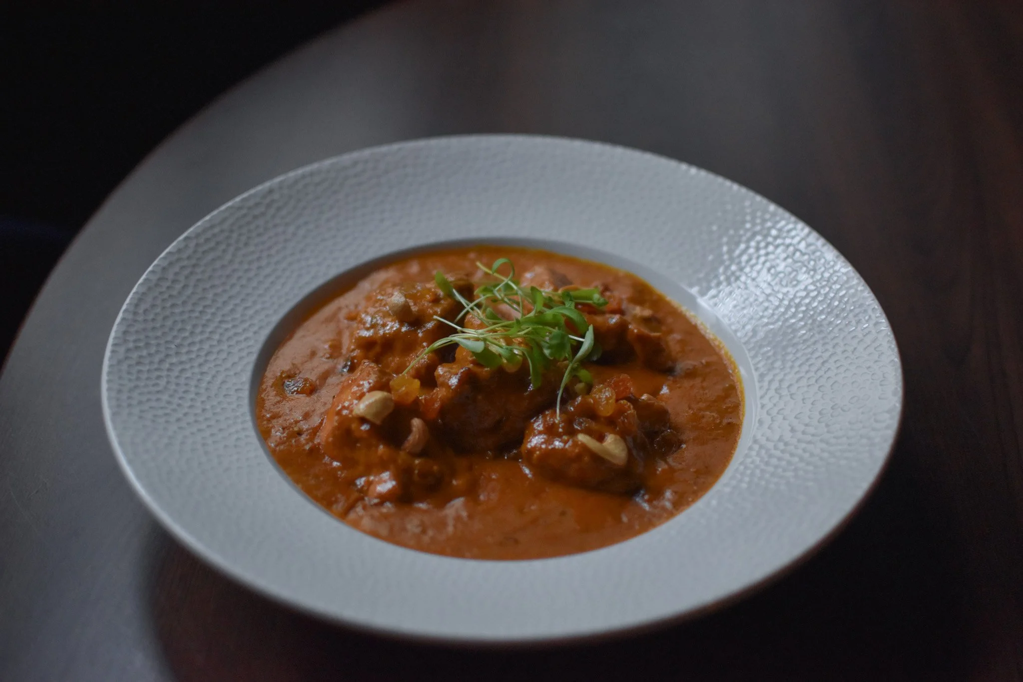 A refined take on Mughlai chicken in Indian cuisine, this dish is built on our house made yellow gravy. Cumin and gently sweated onions form the base, followed by turmeric, hot chilli powder, green chillies, and our own blend of spices, while ghee and butter are added in stages for layered richness. Peeled plum tomatoes and cashews bring body, and the sauce is blended and passed through a fine French bouillon strainer for a smooth finish. A second tempering adds depth and gentle heat, creating a dish that is rich, balanced, and loved by guests across Pwllheli, Porthmadog, and Bangor