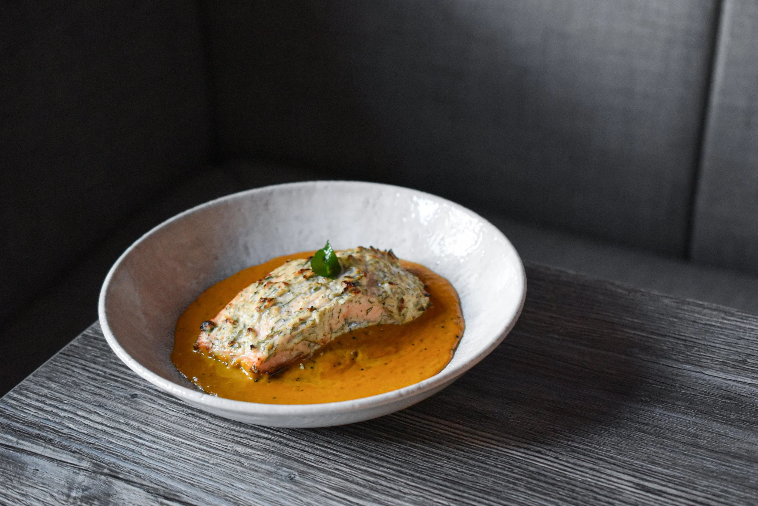 A refined, modern take on a traditional South Indian dish, our Salmon Mappas pairs delicately grilled salmon with a silky coconut milk sauce, gently layered with mustard seeds, fenugreek, curry leaves, fresh green chillies, and softly sweated onions. Tomato purée adds balance, while the coconut base brings warmth, smoothness, and quiet richness. Finished with salmon marinated in ginger, garlic, Greek yoghurt, and a touch of cream cheese, this is an elegant expression of Indian cuisine, loved by guests in Pwllheli, Porthmadog, and Bangor.