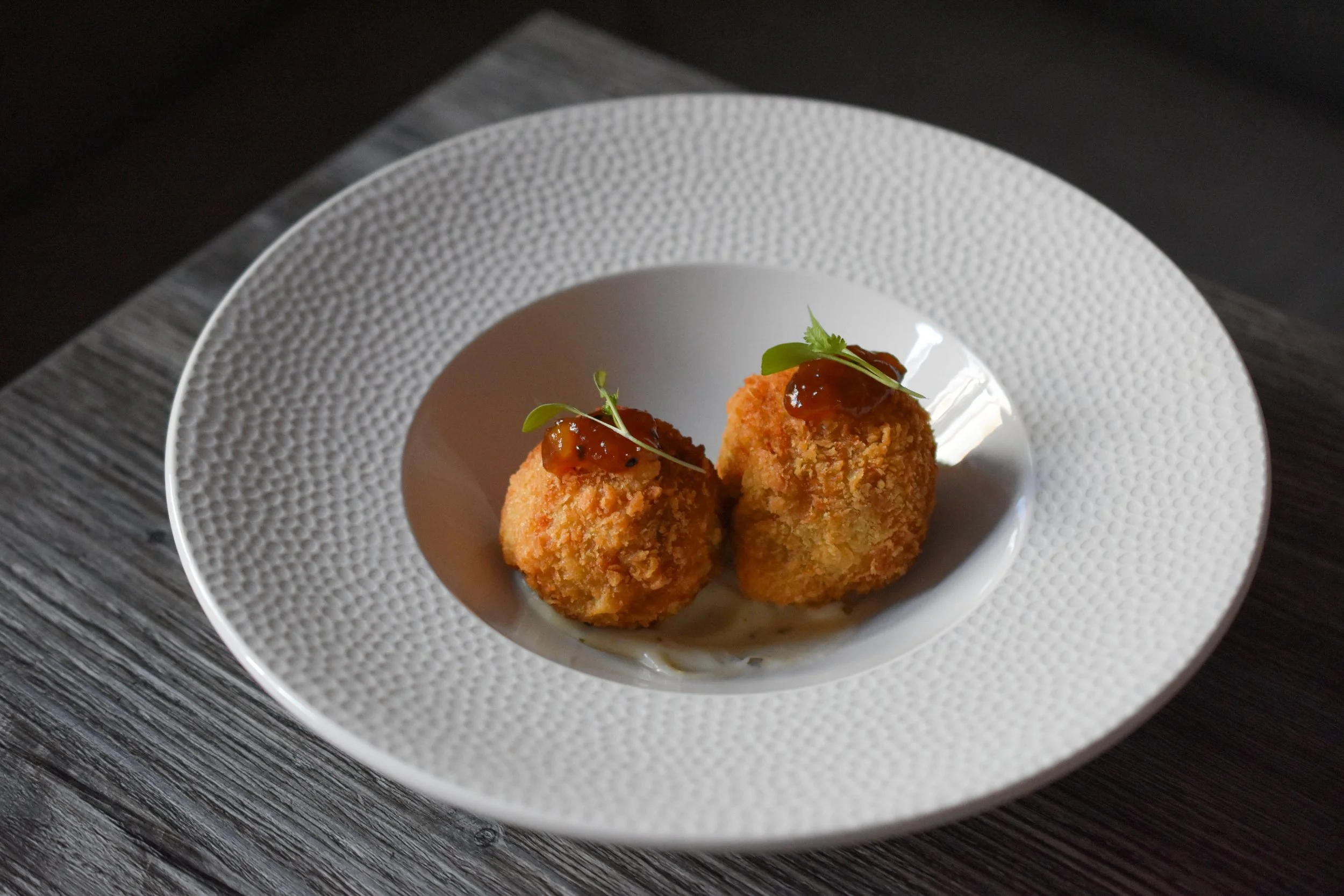 A meeting of two classics, our Chicken Biryani Arancini takes the soul of biryani and reimagines it through the lens of Italian arancini. Rice is delicately scented with whole spices such as fennel and star anise, while diced chicken breast is marinated in yoghurt, mint, coriander, and biryani masala, then tempered in ghee for depth and warmth. The mixture is shaped, crumbed, and fried to a crisp golden shell, revealing a centre that is soft, fragrant, and deeply comforting, a modern Indian favourite loved by guests in Pwllheli, Porthmadog, and Bangor.